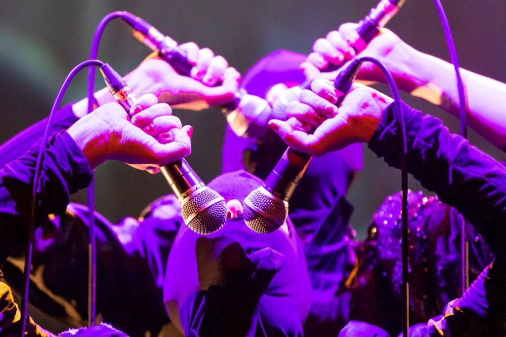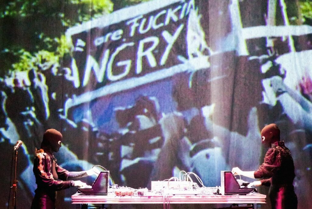 2 performers appear incognito. 2 is the smallest possible number of people needed to represent a conflict. As soon as 2 people mask themselves in the same way, they become a conspiratorial community in secret agreement. They demonstrate an apparatus that can both take over everything and everyone and turn against everything and everyone. Like a tank. Masking is part of the uniformed group that appears like a tank. Masking was (and often is) a reason to break up demonstrations prematurely. It has an escalating effect, which is repeatedly carried out in the clash between the >Black Bloc< and police officers. Their armour forms fronts and demands confrontation: a seemingly always identical ritual that is celebrated and exaggerated, reinterpreted and questioned in the performance.