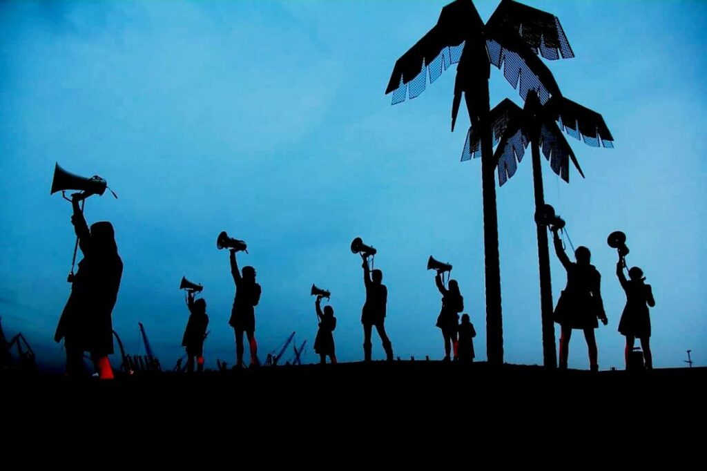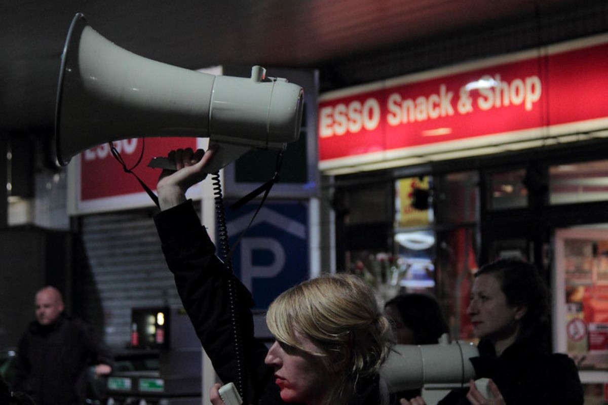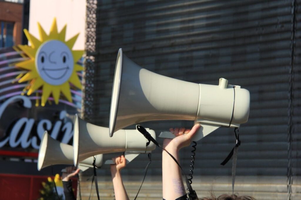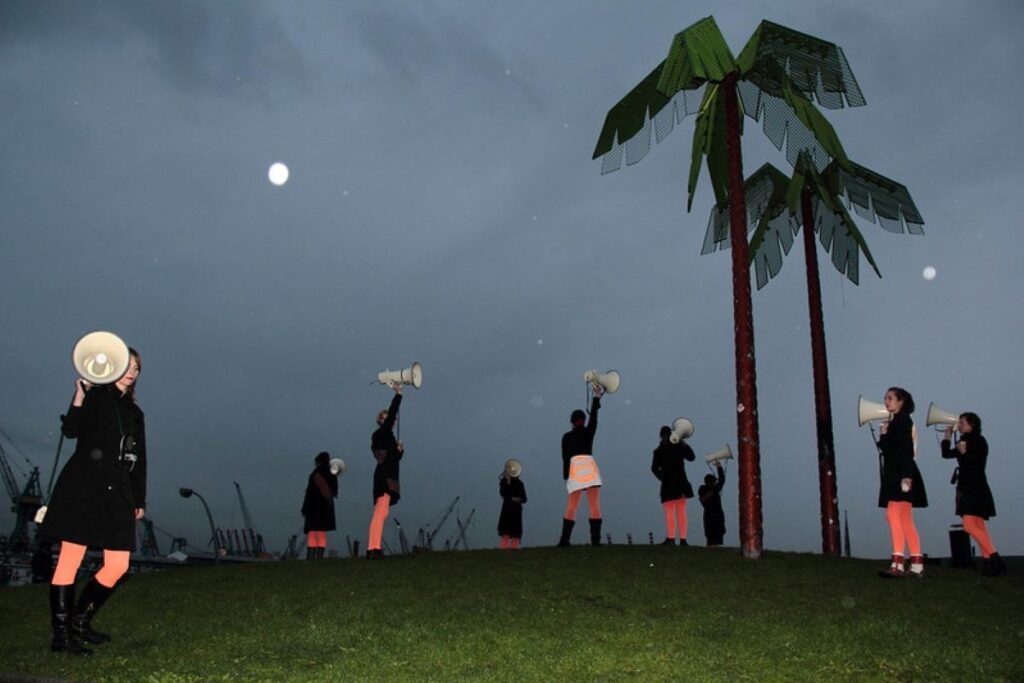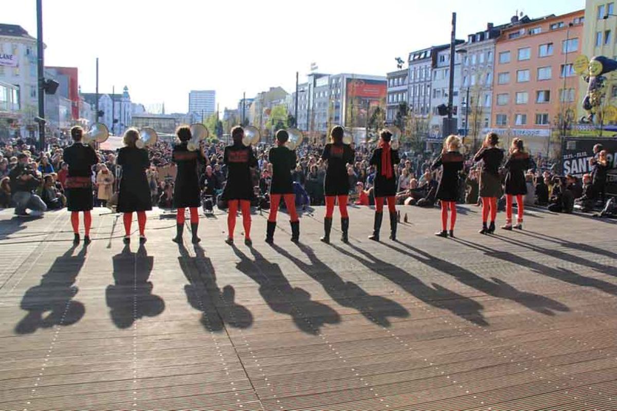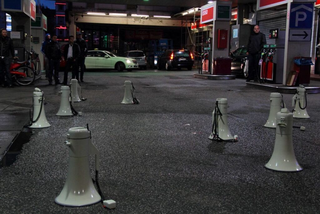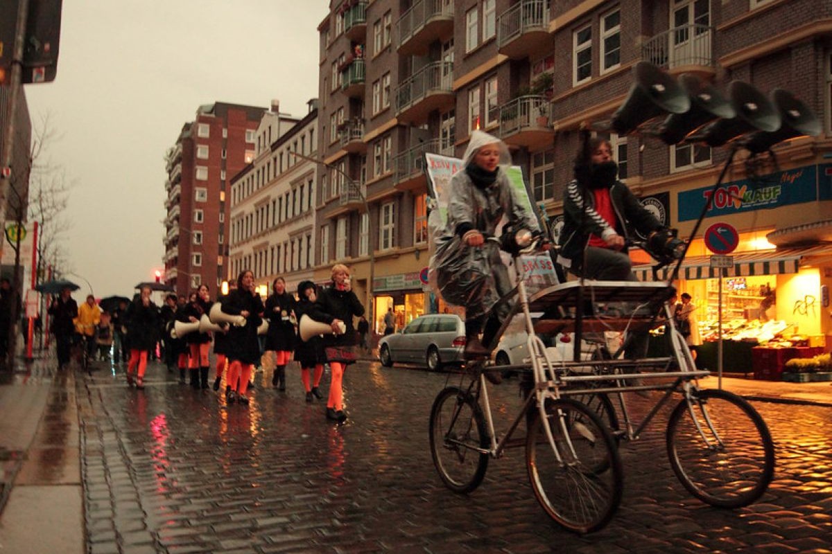 Der ausschließlich mit Frauen* besetzte Megafonchor bringt eine ungewöhnliche und eindringliche Form Politischer Rede hervor, die bewusst nicht eloquent ist: Alltagssprache, die stottert, zögert und sich verspricht. In Partizipativer Künstlerischer Forschung mit Aktivist*innen, Künstler*innen sowie Bewohner*innen und Nachbar*innen der sogenannten „Esso-Häuser“ im Hamburger Stadtteil S. Pauli hat Sylvi Kretzschmar den Megafonchor für den spezifischen Kontext der Recht auf Stadt Bewegung entwickelt und performativ erprobt: 15 Frauen* mit Megafonen verstärken Statements aus Interviews mit Nachbar*innen, Nutzer*innen und Mieter*innen der inzwischen abgerissenen Häuser. In wörtlicher Wiedergabe sprechen sie anstelle der Interviewten. Der Megafonchor kommt als Medium stellvertretender Stimmverstärkung bis heute im Kontext urbaner Proteste zum Einsatz.