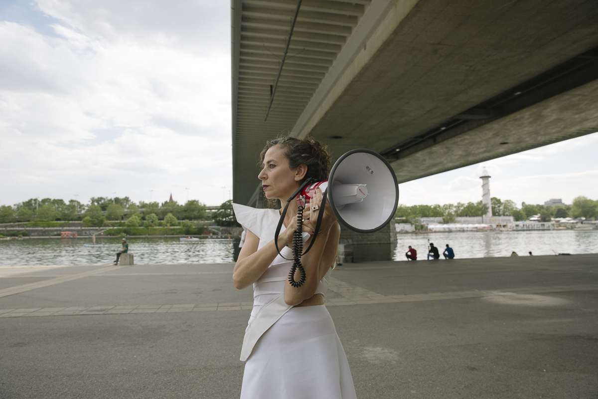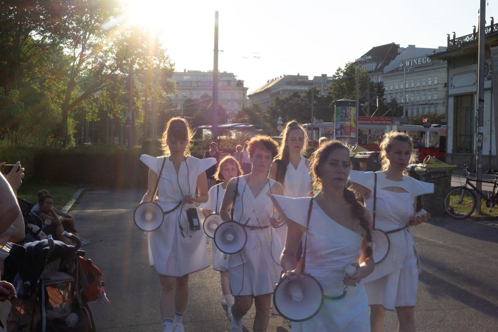 Was wurde durch die „Corona-Krise“ verstärkt? Was wurde seitdem lauter, was vorher kaum wahrnehmbar war? Für welche Sehnsüchte, welche Bedürfnisse, welche Utopien sind die Erfahrungen der Pandemie ein Verstärker? Diese und mehr Fragen haben wir Müttern und Vätern, Pädagog*innen, Pflegekräften, Haushaltshilfen und anderen Menschen gestellt, die in Wien nicht bezahlte/unterbezahlte Fürsorgearbeit leisten. Ein mit Megafonen „bewaffneter“ Frauenchor singt und spricht eine Collage der Interview-Antworten. In einem Hybrid aus Performance, Konzert und Choreographie entsteht eine ungewohnte und neue Form politischer Rede, welche die Megafone als mobile Stimmverstärker und Musikinstrumente in ihren klanglichen, rhythmischen und skulpturalen Potenzialen auslotet.
